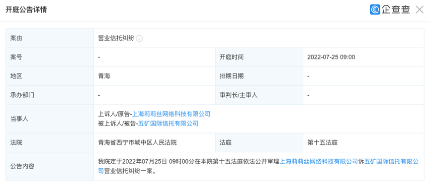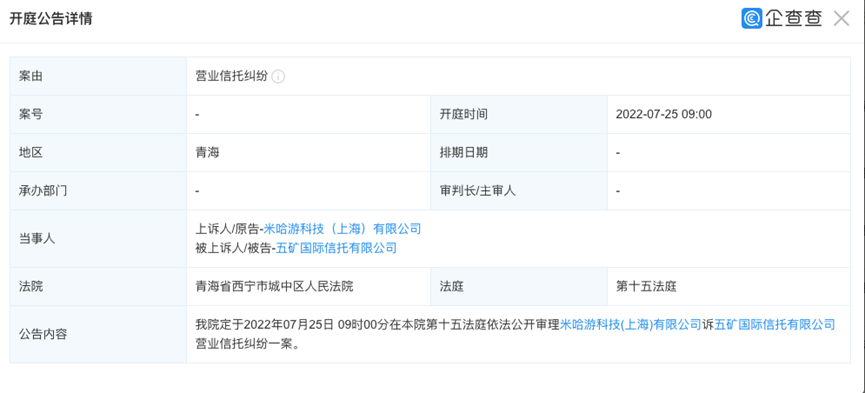 原因来自一则开庭公告:青海西宁市城中区人民法院定于7月25日公开审理米哈游诉五矿国际信托有限公司营业信托纠纷一案。