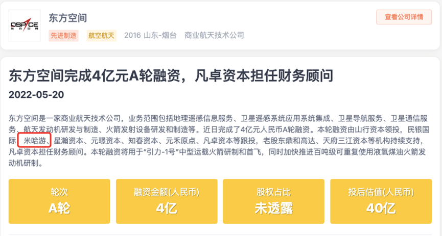 公开信息显示,此次融资将用于“引力-1号”中型运载火箭研制和首飞,同时加快推进百吨级可重复使用液氧煤油火箭发动机研制。而此次投资方,就包括米哈游。