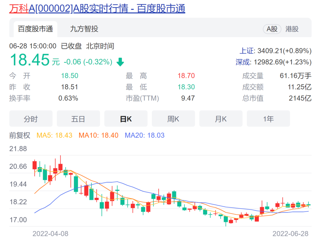 截至6月28日收盘,万科股价报收18.45元/股,跌0.32%,总市值2093亿元。