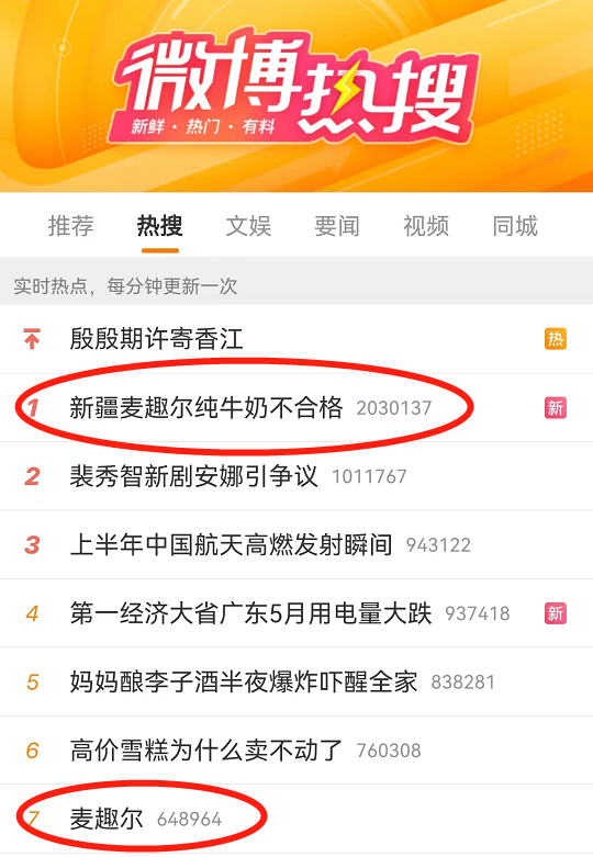 6月30日凌晨,一条关于麦趣尔的词条快速升至微博热搜第一。