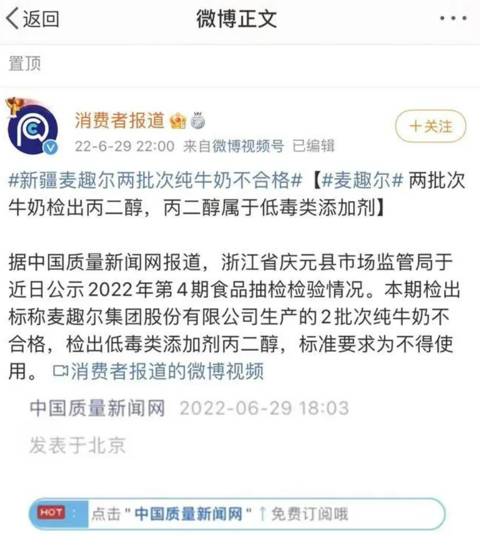 据@消费者报道,麦趣尔两批次牛奶检出丙二醇,丙二醇属于低毒类添加剂。