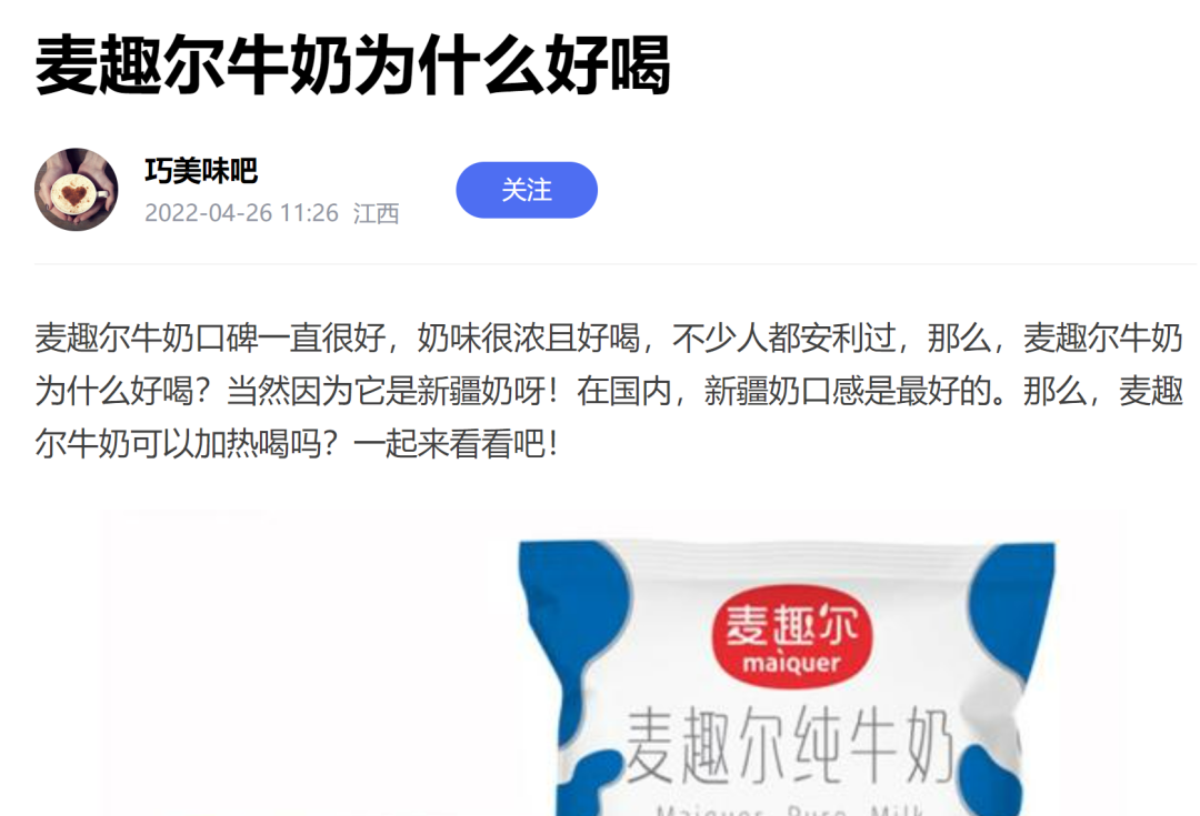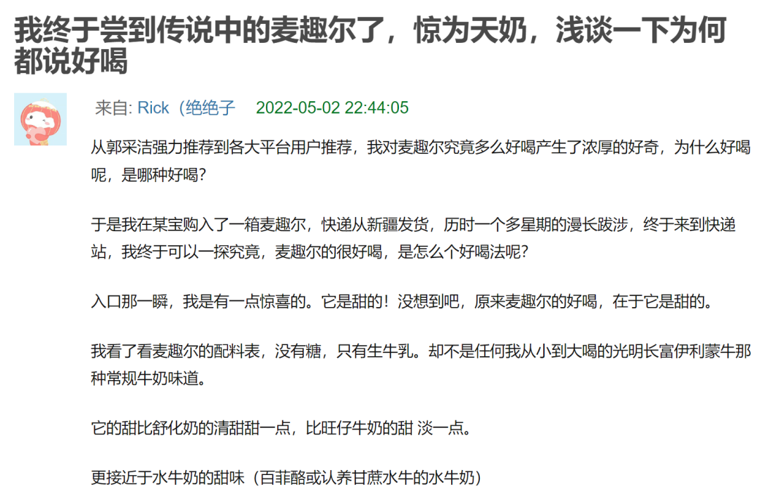 据悉,麦趣尔牛奶一直因“好喝”备受消费者青睐,此前网络上还有关于“麦趣尔牛奶为什么好喝的”提问和新闻报道,并且有网友称其“惊为天奶”。