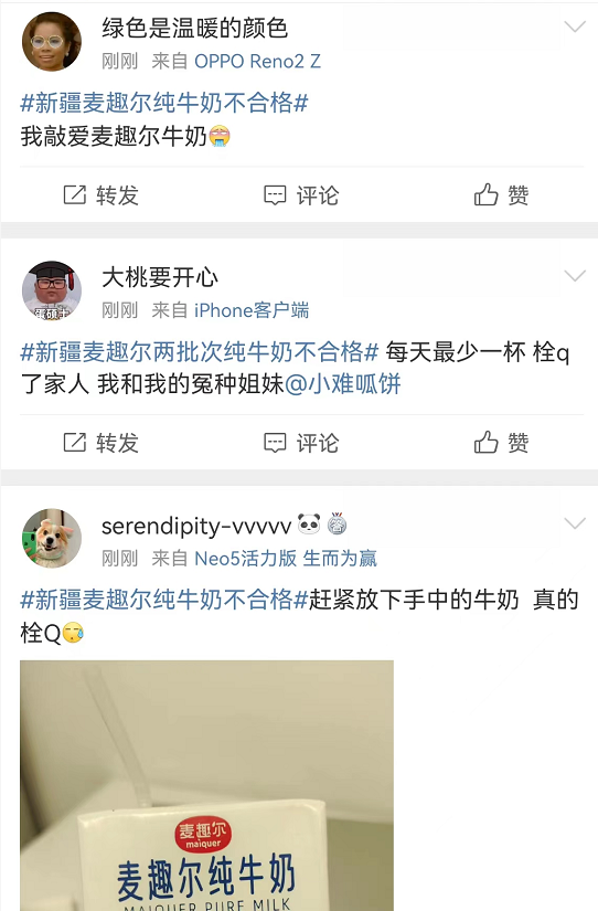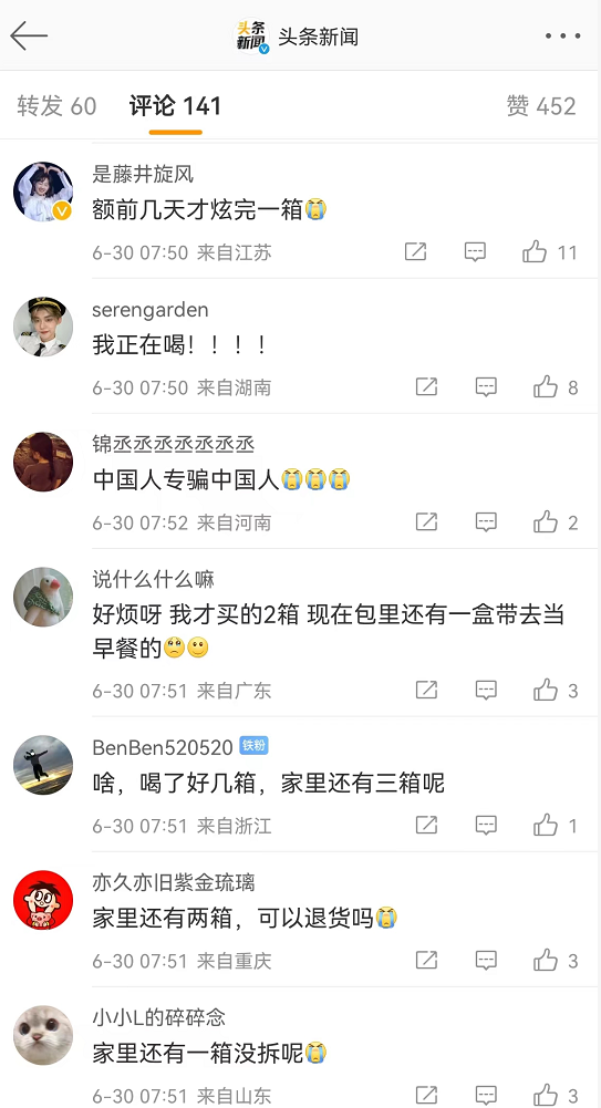 质量问题被曝光后,微博评论区也炸开了锅,网友们纷纷表示爱喝的牛奶也“塌房”了,还有消费者询问“家中的囤货能退货吗”?