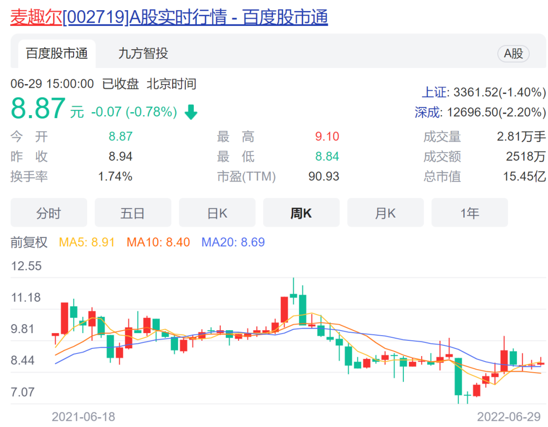 二级市场上,截至上一个交易日,麦趣尔报8.87元/股。