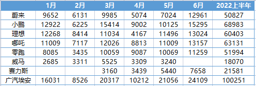 部分车企2022上半年累计交付量统计