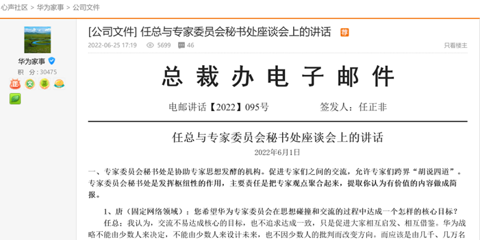 7月4日,华为心声社区最新公开创始人兼CEO任正非与专家委员会秘书处座谈纪要。