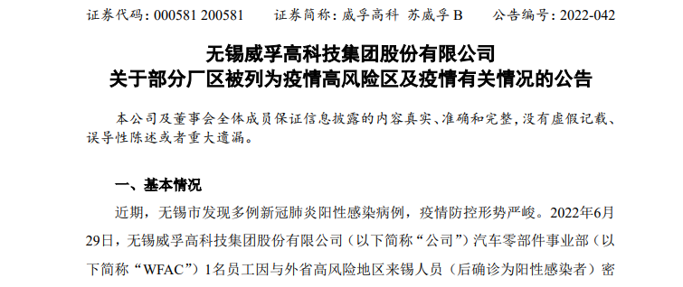7月4日晚间,总部位于无锡的威孚高科(000581)公告称,公司位于锡兴路30号的厂区被列为疫情高风险区,其他厂区因配合政府部门的流调工作,部分产线存在临时停工或减产情况,部分员工存在临时居家或集中隔离等情况。