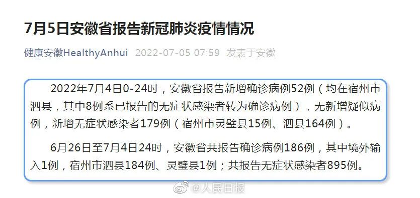2022年7月4日0-24时,安徽省报告新增确诊病例52例(均在宿州市泗县,其中8例系已报告的无症状感染者转为确诊病例),无新增疑似病例,新增无症状感染者179例(宿州市灵璧县15例、泗县164例)。