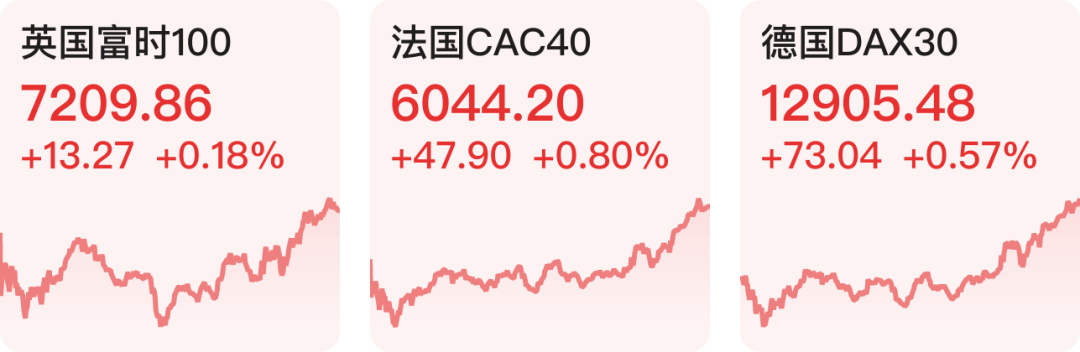 欧洲三大指数全线上涨。截至收盘,英国富时100指数涨0.18%,法国CAC40指数涨0.8%,德国DAX30指数涨0.57%。