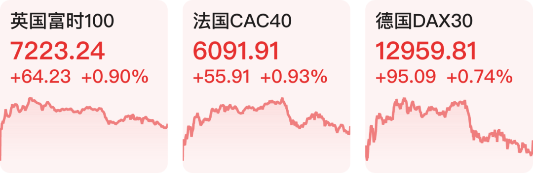 欧洲三大指数全线上涨。截至收盘,英国富时100指数涨0.9%,法国CAC40指数涨0.93%,德国DAX30指数涨0.74%。