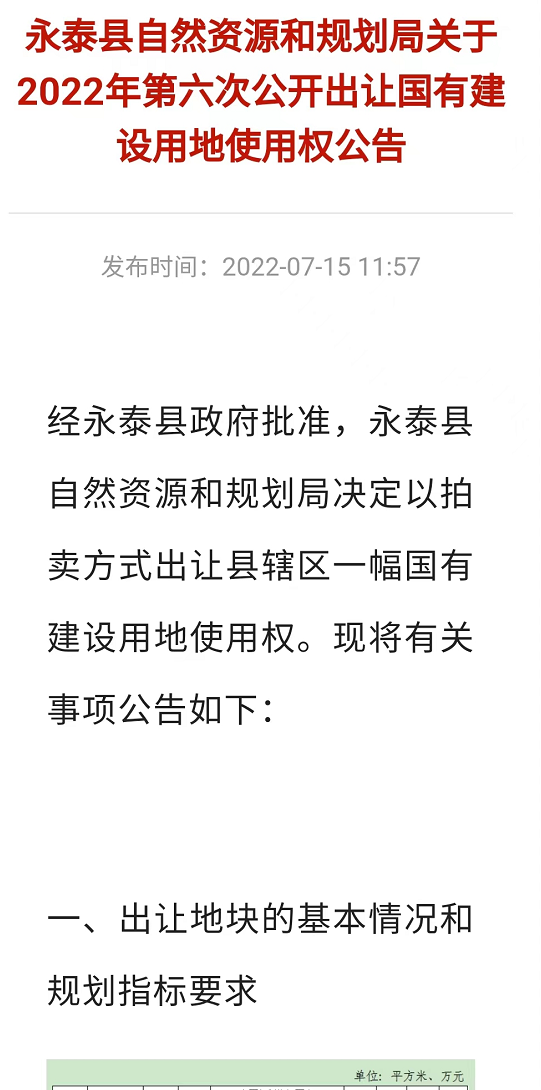7月15日,永泰县自然资源和规划局发布了一则关于2022年第六次公开出让国有建设用地使用权公告。