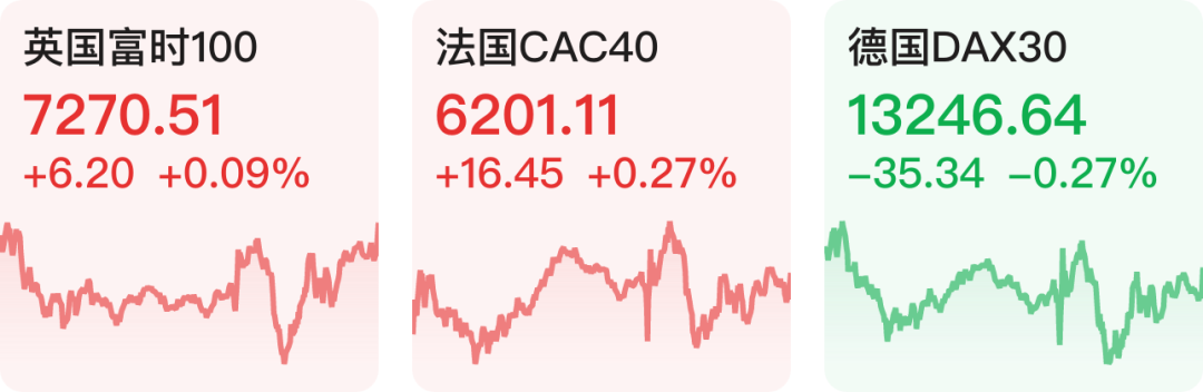 欧洲三大指数涨跌不一。截至收盘,英国富时100指数涨0.09%,法国CAC40指数涨0.27%,德国DAX30指数跌0.27%。
