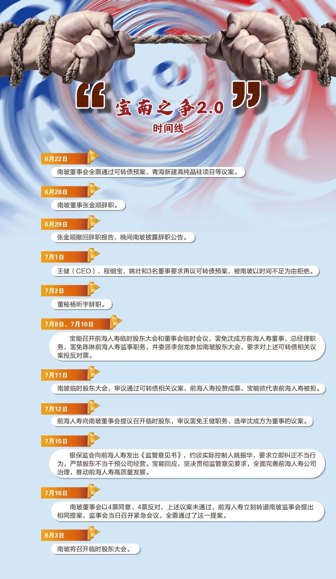 6月28日、7月2日,南玻董事张金顺、董秘杨昕宇辞职,当时不起眼的两则公告与纷争有莫大的关联。其后,风云突变。在宝能主导下,前海人寿7月8日、7月10日召开临时股东大会和董事会临时会议,罢免沈成方前海人寿董事、总经理职务,罢免陈琳前海人寿监事职务,并委派李剑龙作为唯一授权人参加南玻股东大会,要求对上述可转债相关议案投反对票。