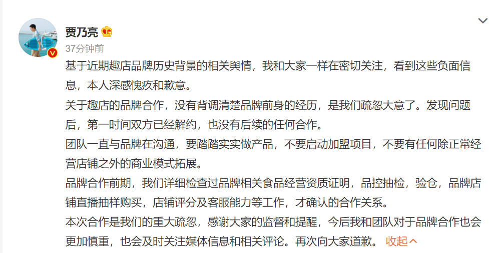 为趣店代言而被推上风口浪尖的贾乃亮,终于发声了……