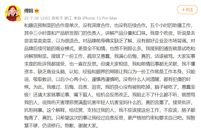 26日中午,知名脱口秀演员傅首尔率先在发布长文道歉称:和趣店预制菜的合作是单次,没有深度合作,也没有后续合作。对品牌前身确实缺乏了解,没有做好企业及市场背调。对品牌后续可能的商业模式,更是全不知情,也想不到那么多。接错了一份工作,疏忽又愚蠢,我满心后悔,真的,活该被骂。大家实事求是的批评我都接受,也一直在反思。接受批评,抗拒网暴。我智慧不够,仍须修行。抱歉,谢谢大家。