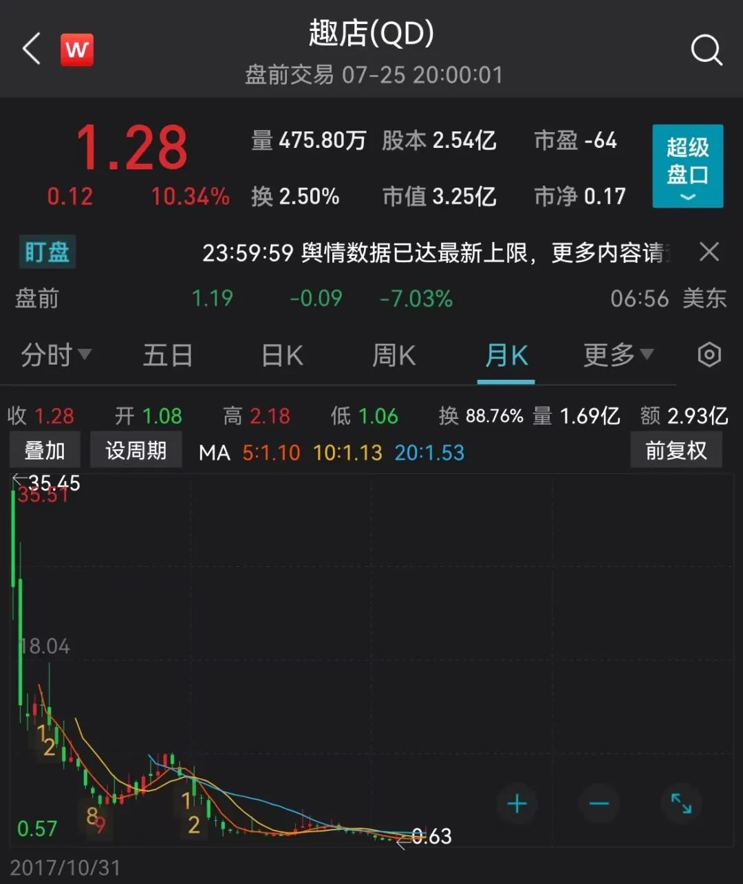 作为一个连续创业者,罗敏也曾风光万分,年仅34岁,就成为市值百亿美元的上市公司的CEO,实现自己年轻时许下的“去美国敲钟”的愿望。但“上市即巅峰”,上市仅仅几天,趣店股价很快跌破发行价,随后股价一路下泻,仅仅半年,股价就跌到10美元以下。2020年,趣店股价直接跌到了2美元上下徘徊。如今,趣店股价已经跌至1美元以下。相较上市之初的100亿美元市值,如今趣店的市值只有3亿美元左右,四年多时间蒸发了97%。