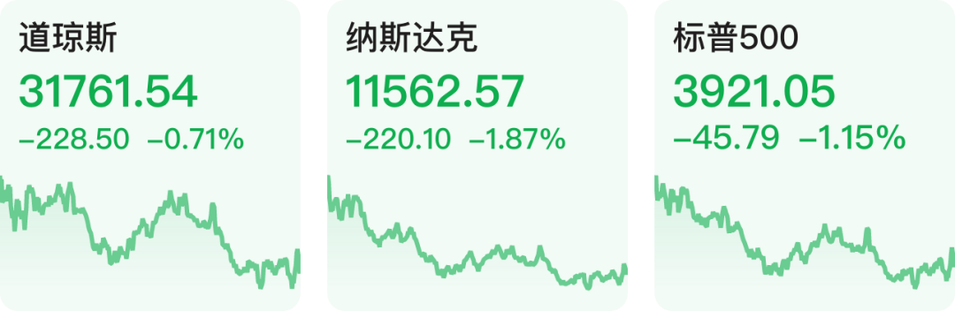 美股三大指数集体收跌,道指跌0.71%,标普500指数跌1.15%,纳指跌1.87%。大型科技股普跌,亚马逊跌超5%,Meta跌超4%,特斯拉跌超3%,谷歌、微软、英伟达跌超2%。贵金属板块走强,金田、哈莫尼黄金涨超4%。