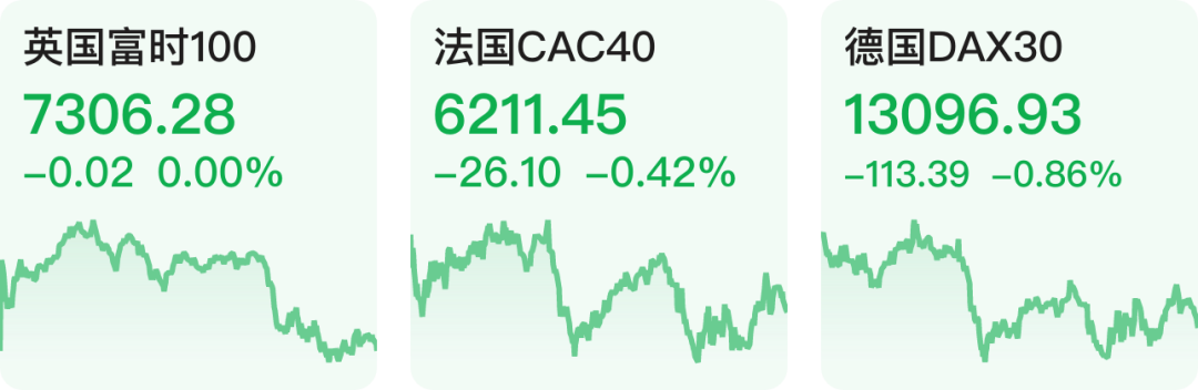 欧洲三大指数全部下跌。截至收盘,英国富时100指数跌0.00%,法国CAC40指数跌0.42%,德国DAX30指数跌0.86%。