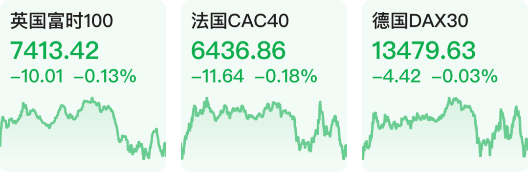 欧洲三大指数全部下跌。截至收盘,英国富时100指数跌0.13%,法国CAC40指数跌0.18%,德国DAX30指数跌0.03%。