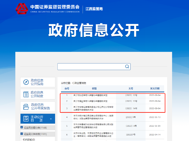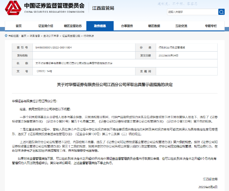 8月4日,江西证监局对华福证券江西分公司出具警示函。由于基金销售中存在多项违规,该分公司被认为合规管理不到位、内部控制不完善。直接责任人、分公司负责人也被一同出具警示函。