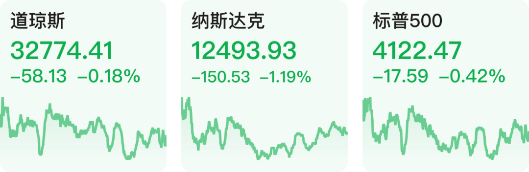 美股三大股指全线下跌。标普500指数跌0.42%,报4122.47点;道指跌0.18%,报32774.41点;纳指跌1.19%,报12493.93点。大型科技股多数下跌,亚马逊、奈飞、脸书跌超1%,谷歌小幅下跌;苹果、微软小幅上涨;芯片股跌幅居前。热门中概多数走低。
