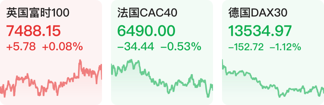 欧洲三大指数涨跌不一。截至收盘,英国富时100指数涨0.08%,法国CAC40指数跌0.53%,德国DAX30指数跌1.12%。
