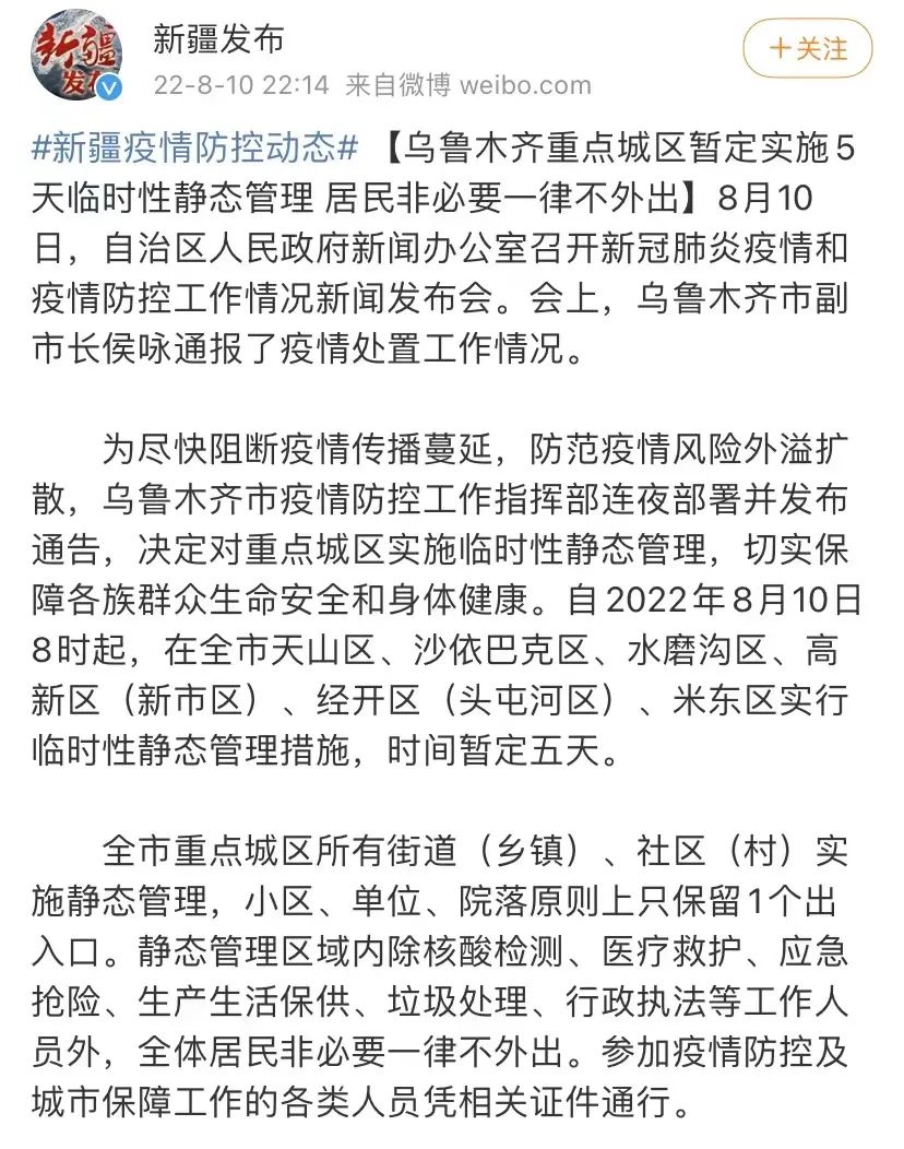 为尽快阻断疫情传播蔓延,防范疫情风险外溢扩散,自2022年8月10日8时起,乌鲁木齐天山区、沙依巴克区、水磨沟区、高新区(新市区)、经开区(头屯河区)、米东区实行临时性静态管理措施,时间暂定五天。
