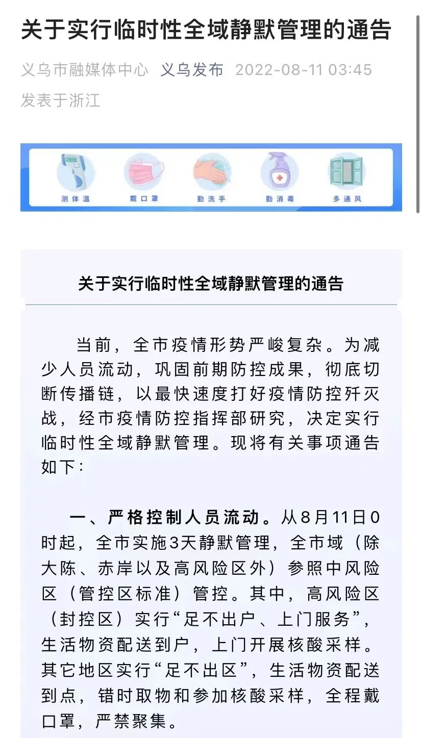 8月10日义乌发布通告:从0时起,全市实施3天静默管理,全市域(除大陈、赤岸以及高风险区外)参照中风险区(管控区标准)管控。