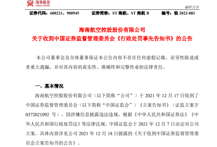 时隔近8个月,ST海航于昨日(8月10日)晚间率先公告了立案调查进展,公司称已收到证监会《行政处罚事前告知书》。