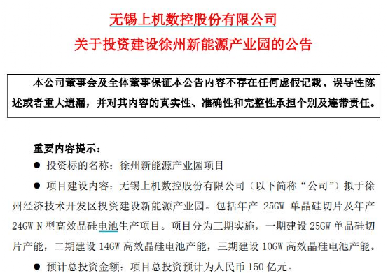 8月15日晚,光伏“黑马”上机数控(603185)又抛出大手笔投资。该公司公告宣布,拟在徐州投建新能源产业园,包括年产25GW单晶硅切片及年产24GW N型高效晶硅电池项目,总投资额达到150亿元。