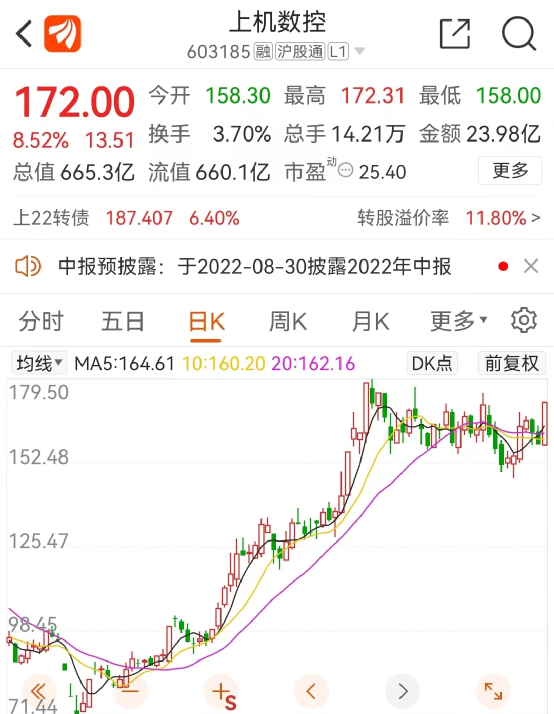 如此凶猛投资扩产,也引来机构助兴。自5月引来,浙商证券一连串为其发布5篇研报。而上机数控自4月底以来,股价从最低71.95元/股一路涨至最高179.5元/股,涨幅高达149.48%。截至15日收盘,该公司市值达到665亿元。