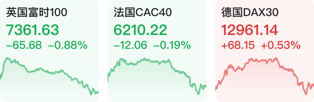 欧洲三大指数涨跌不一。截至收盘,英国富时100指数跌0.88%,法国CAC40指数跌0.19%,德国DAX30指数涨0.53%。
