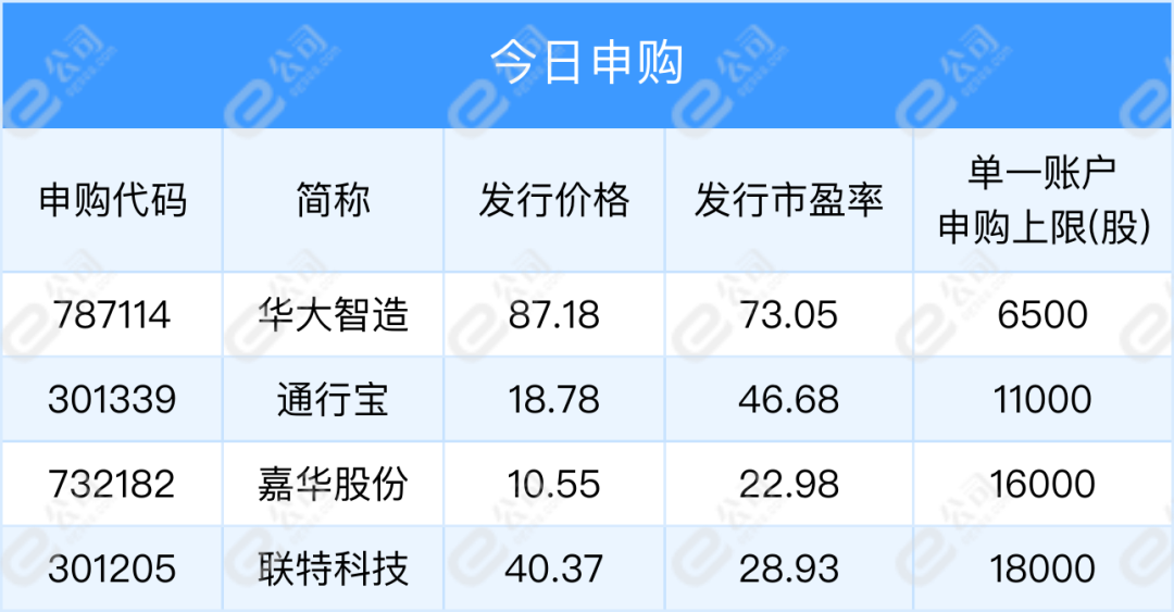 华大智造、通行宝、嘉华股份、联特科技今日新股申购;