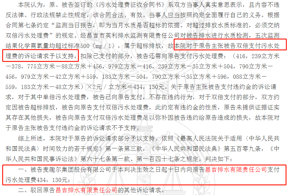 民事判决书显示,2021年10月15日,原告昌吉排水有限责任公司(乙方)与被告麦趣尔集团股份有限公司(甲方)签订《污水处理费征收合同书》一份,约定原告为被告提供城市污水处理服务,合同期限为3年,即自2020年1月1日至2022年12月31日止。