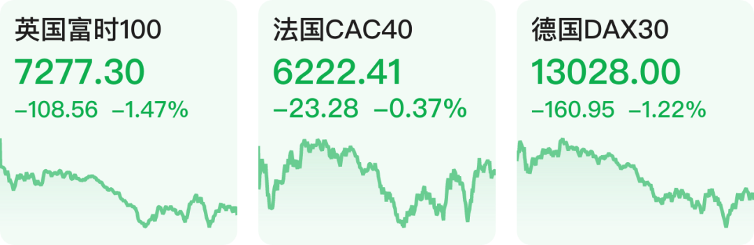 欧洲三大指数全部下跌。截至收盘,英国富时100指数跌1.47%,法国CAC40指数跌0.37%,德国DAX30指数跌1.22%。