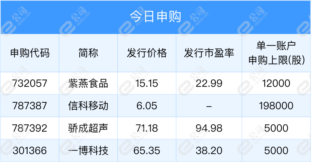 今日可申购紫燕食品、信科移动、骄成超声和一博科技;