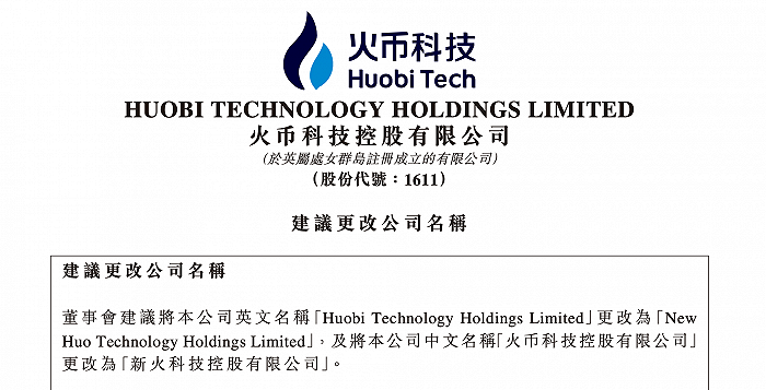其中文名称“火币科技控股有限公司”将更改为“新火科技控股有限公司”,英文名称“Huobi Technology Holdings Limited”改为“New Huo Technology Holdings Limited”。