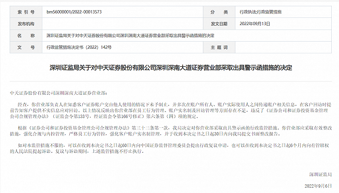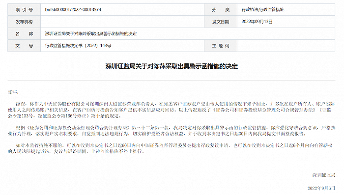 深圳证监局近日公告两则罚单,对中天证券深圳深南大道营业部及其负责人陈萍均作出出具警示函的行政处罚决定。