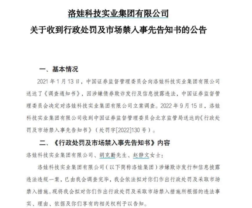早在2021年1月,因涉嫌债券欺诈发行及信披违法,洛娃集团被证监会立案调查。日前,洛娃集团披露公告显示,证监会拟对其以虚假申报文件骗取公开发行债券的行为处罚3600万元,对其信息披露虚假记载的行为处以60万元罚款。