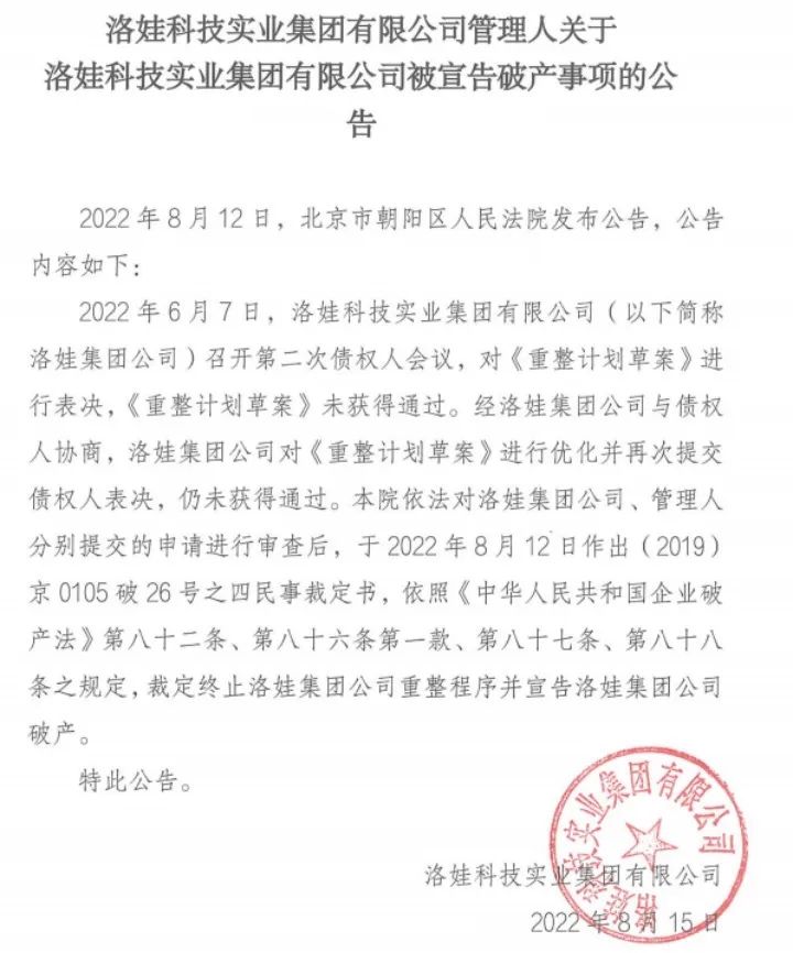 8月12日,北京市朝阳区人民法院发布公告,因《重整计划草案》未获得债权人会议通过,法院裁定终止洛娃集团公司重整程序并宣告洛娃集团公司破产。