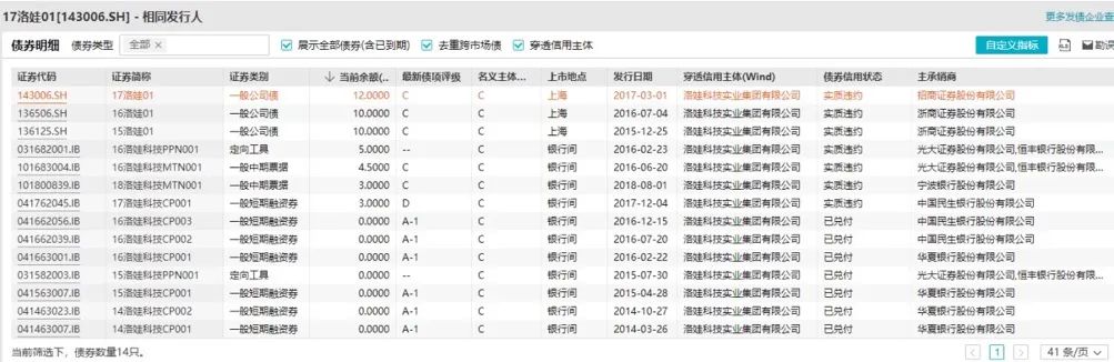 Wind数据显示,洛娃集团自2014年开始发行债券14只,其中7只处于实质违约状态,合计违约本金共47.5亿元。