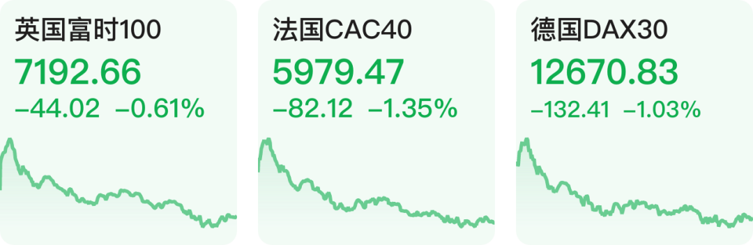欧洲三大指数全部下跌。截至收盘,英国富时100指数跌0.61%,法国CAC40指数跌1.35%,德国DAX30指数跌1.03%。