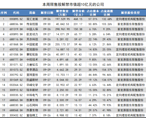 本周解禁数量超过1亿股的公司有10家,分别为双汇发展、传音控股、中国人保、航发动力、中国能建、爱旭股份、赛轮轮胎(601058.SH)、壹网壹创(300792.SZ)、华峰化学(002064.SZ)、江南化工(002226.SZ)。