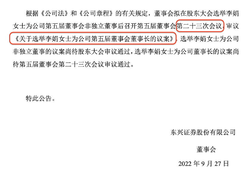 东兴证券公告显示,今年9月自控股股东方(中国东方资产管理股份有限公司)空降的李娟女士,或将接任掌舵者。9月26日,东兴证券第五届董事会第二十二次会议同意提请股东大会选举李娟女士为公司第五届董事会非独立董事,并将于第二十三次会议审议选举李娟为董事长的议案。