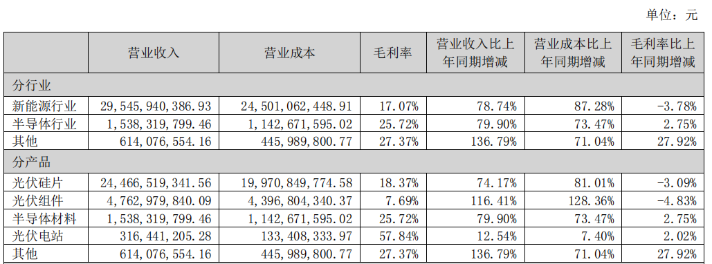此外,TCL中环对新能源行业的重视和依赖远超于半导体行业。半年报显示,上半年新能源行业占总营业收入比重为93.21%,而半导体行业进一步下降至4.85%。