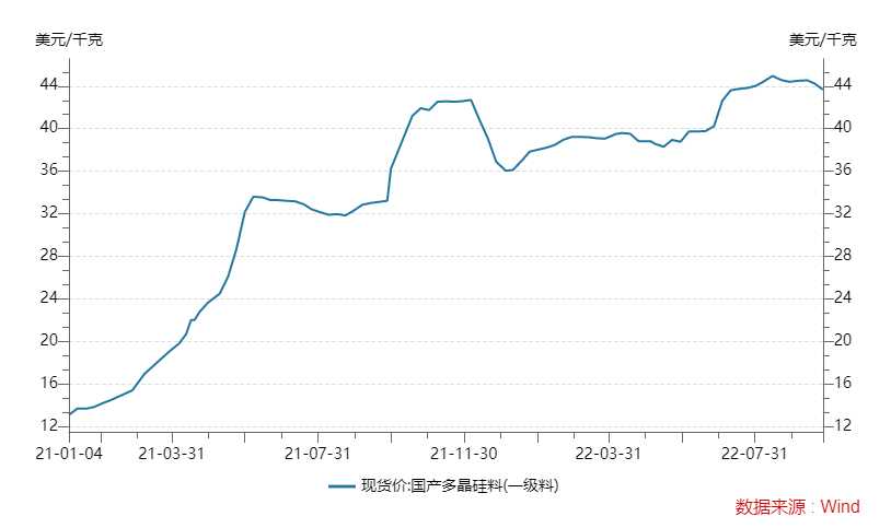 WIND数据显示,国产多晶硅料(一级料)价格在第三季度持续保持历史高位区间,在8月15日更是创下了44.95美元/千克的纪录。