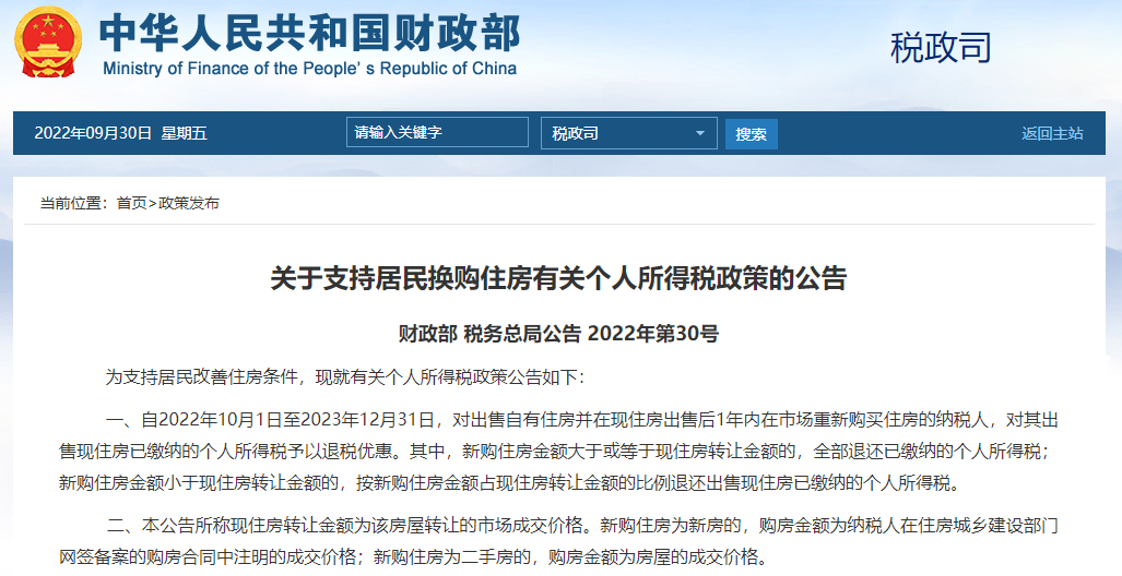 公告表示,自2022年10月1日至2023年12月31日,对出售自有住房并在现住房出售后1年内在市场重新购买住房的纳税人,对其出售现住房已缴纳的个人所得税予以退税优惠。