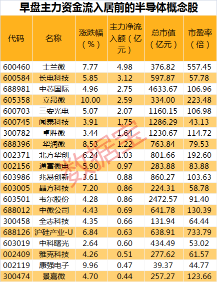 从资金流向来看,早盘9只半导体概念股获主力资金净流入1亿元以上,士兰微净流入居前,达4.98亿元。长电科技、中芯国际、立昂微、三安光电获2亿元以上净流入。长期来看,士兰微近5日主力净流入额高达13.1亿元,在全部A股中排第三位。