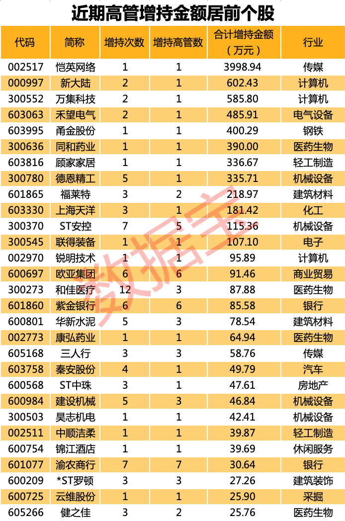 证券时报•数据宝统计显示,从增持金额看,近10日增持金额最多的是恺英网络,累计增持906.79万股,增持金额合计3998.94万元;其次是新大陆,增持量为39.39万股,增持金额602.43万元;万集科技近10日累计获高管增持585.80万元,增持金额位居第三。