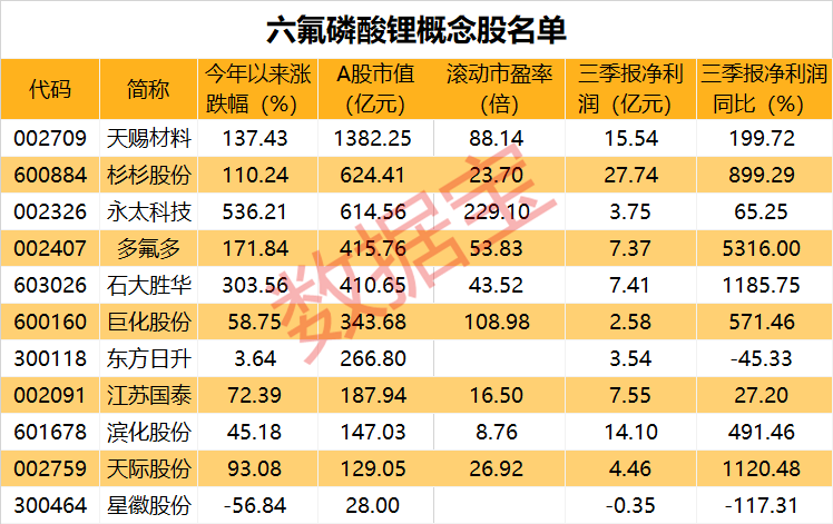 证券时报·数据宝统计,A股中,有11只股票涉及六氟磷酸锂概念。天赐材料是锂电池电解液龙头公司之一,公司配套布局电解液和磷酸铁锂的关键原材料生产能力,包括六氟磷酸锂、新型电解质、磷酸铁和锂辉石精矿等。近日,天赐材料公告,公司全资子公司九江天赐建设的年产6万吨液体六氟磷酸锂装置及年产15万吨电解液母液配制装置已经完成了生产设备的安装及调试,具备了开车试生产条件;上述装置已正式投料,进入试生产阶段。